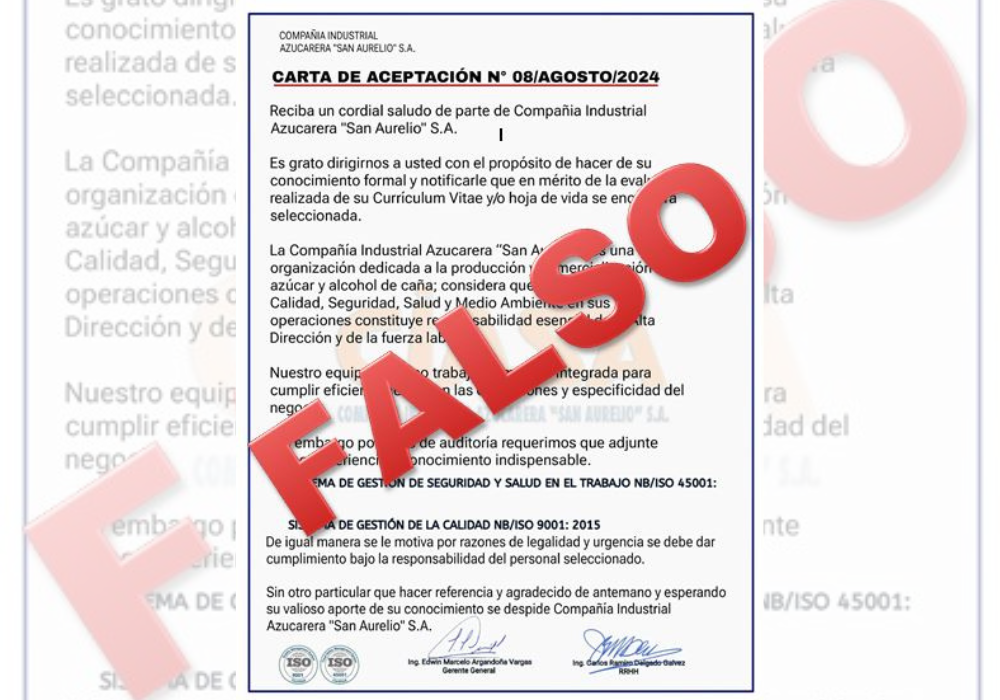 La Compañía Industrial azucarera " San Aurelio" (CIASA S. A. ) se ve obligada a comunicar al público que sus requerimientos de personal son publicados en su página oficial web (www.sanaurelio.com), y cuando lo hace mediante prensa no utiliza  emblemas  oficiales del gobierno, u otros,  y menos solicita pagos previos por cualquier concepto. Finalmente, aclara que NO NECESITA el personal como el mencionado en una publicación "FALSA"  que circula en las redes  sociales con una dirección de correo también "FALSA".
